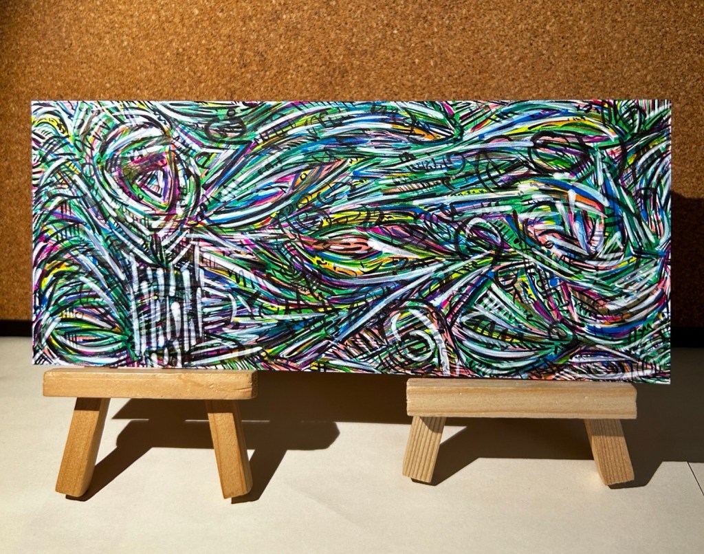 This is a pretty special piece for me to declare finished, because my automatic tendency is to turn it into mud and quickly give up. But no more! Now that I have reliable methods for imparting yellow and white (and various other hues that once scared me), I can really just let loose. This one is actually the first of its kind to have this particular combination of utensils: uniball jetstream 1.0mm baby blue ballpoint, numerous kuretake brush pens (zig real color bristle), white sharpie acrylic paint pen.