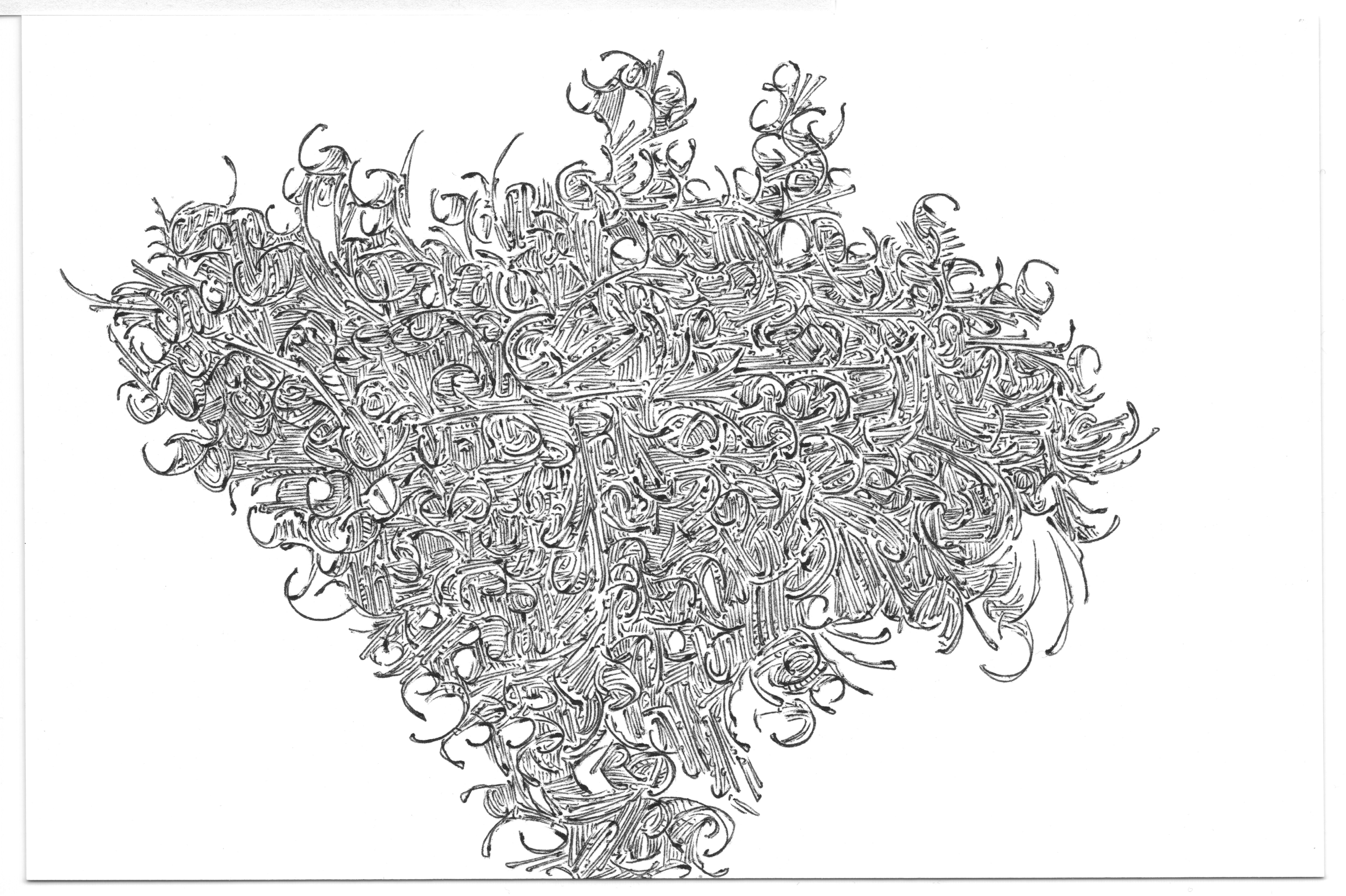 This is a pretty special piece for me to declare finished, because my automatic tendency is to turn it into mud and quickly give up. But no more! Now that I have reliable methods for imparting yellow and white (and various other hues that once scared me), I can really just let loose. This one is actually the first of its kind to have this particular combination of utensils: uniball jetstream 1.0mm baby blue ballpoint, numerous kuretake brush pens (zig real color bristle), white sharpie acrylic paint pen.